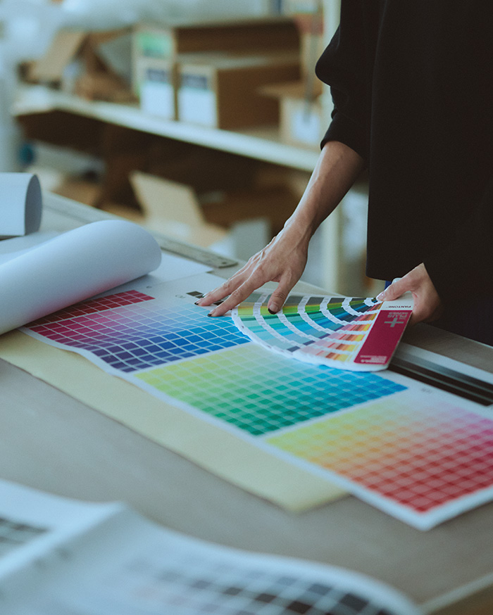 More展示会では、社名看板・説明パネル・誘導サインなど多くのグラフィックデザインが必要になります。一瞬で伝わる、印象づけるデザインを心がけ、空間全体との調和も重視して制作。使用するメディアも、紙・クロス・布など様々な素材の中から最適なものを選定します。