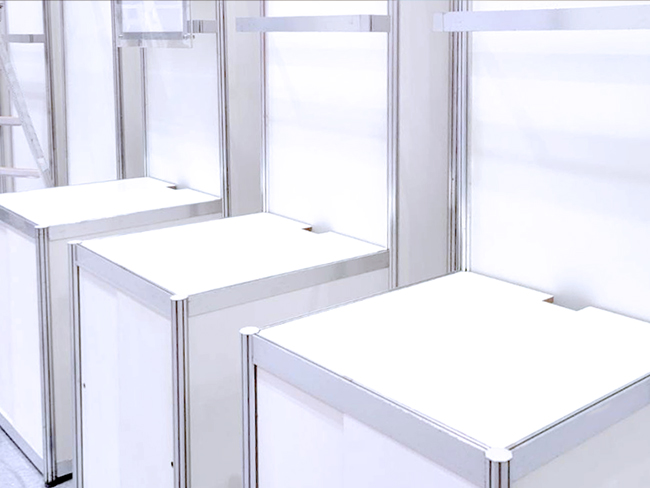 Moreオクタノルムやマキシマライトなどのシステムユニットは、展示会やイベントのブースで多く使用されている定番の構造材。規格サイズのフレームとパネルを組み合わせてブースを構成するため、準備期間が短く、コストも抑えやすいのが特⻑です。