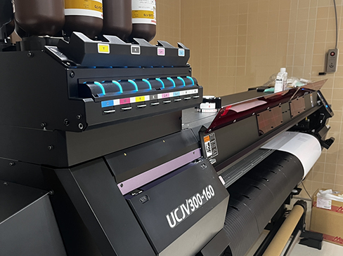 ターポリン(耐久性に優れたビニール素材の布)、トロマット(柔らかな布)、ポンジ(薄くて軽い布) 等の布素材に出力(印刷)を行い、大判サイン・旗・バナー・タペストリーとして使用します。 バナースタンドとセットで活用することもあります。
