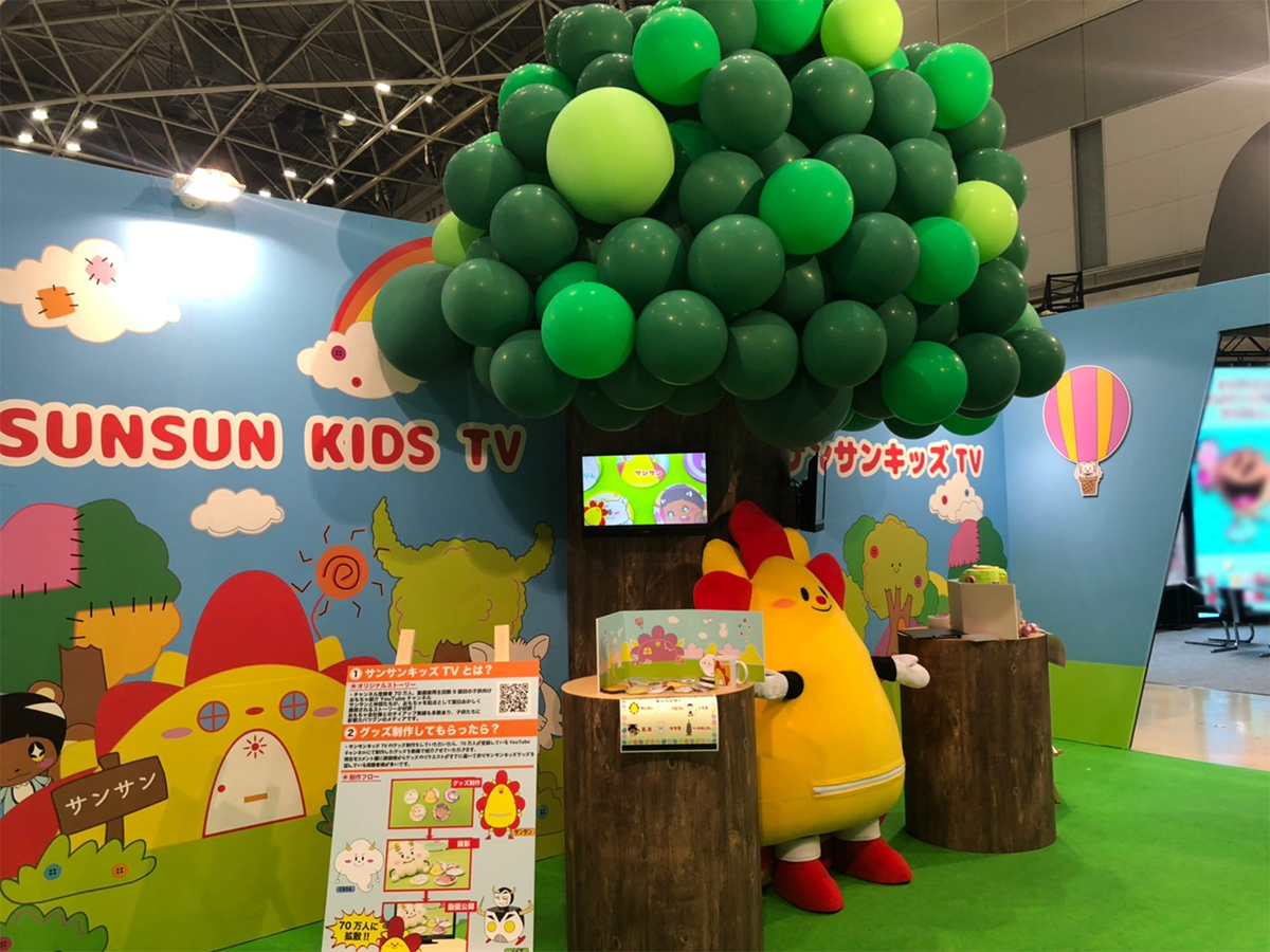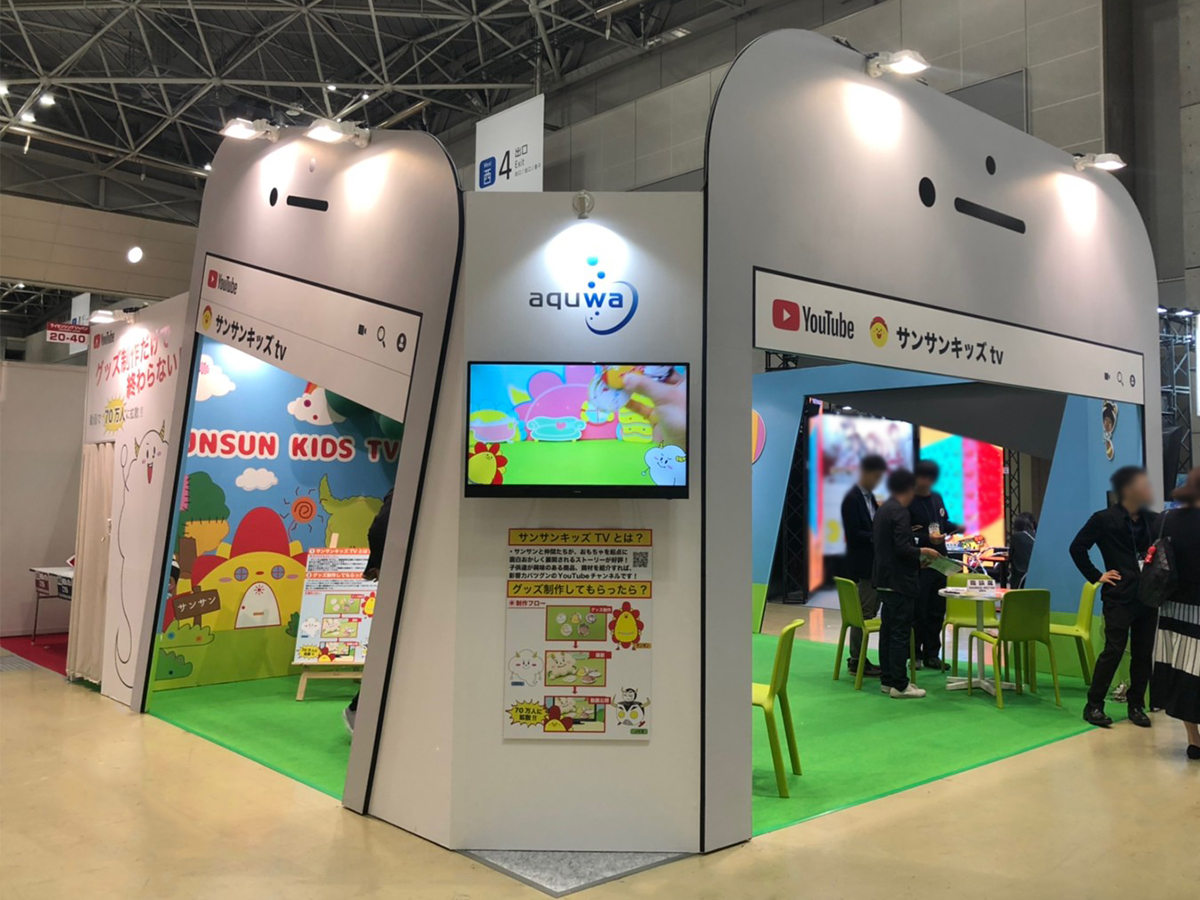 YouTubeで人気のチャンネル「サンサンキッズ.tv」の世界観をブースに落とし込みました。ブース入り口がスマートフォン…中に入ると「サンサンキッズ.tv」の世界、というユーモア溢れるブースは多くの来場者のフォトスポット的存在に。予想以上に好評価なブースでクライアント様から熱い喜びの声を頂きました。