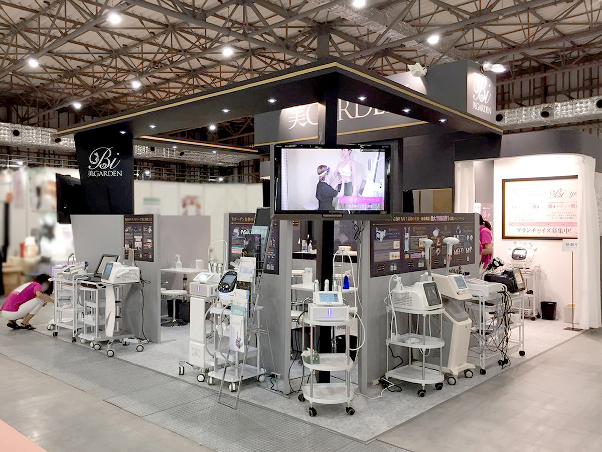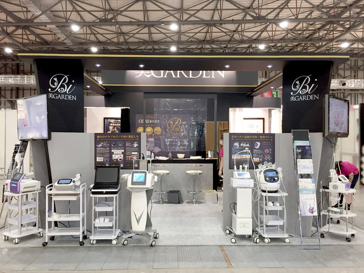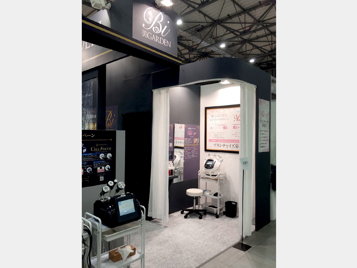 前回に引き続き、洗礼されたブースデザインが定着した美ガーデン様。美容機器を引き立てるために色味を抑え、高級感のあるブースデザインに。商品の多さを感じさせない上品なブースとなりました。