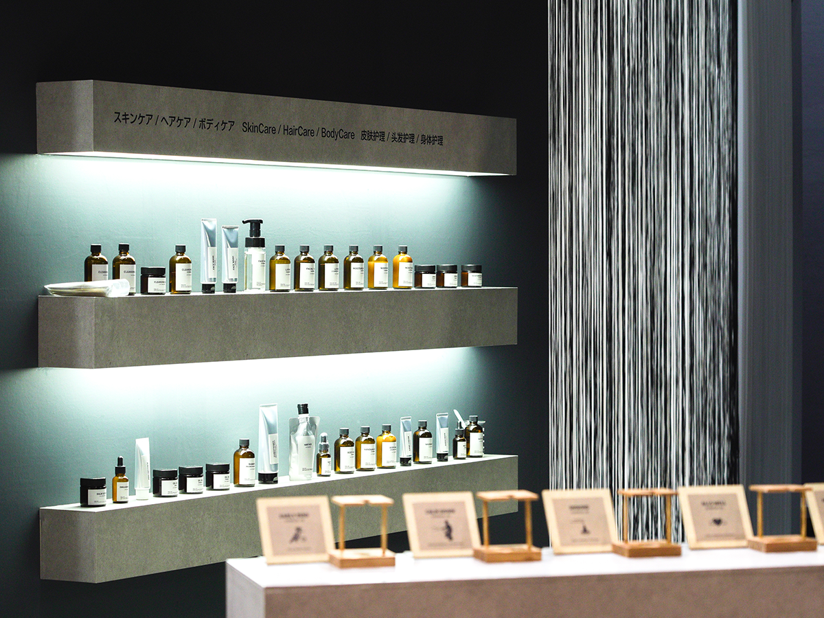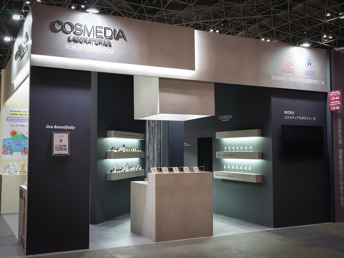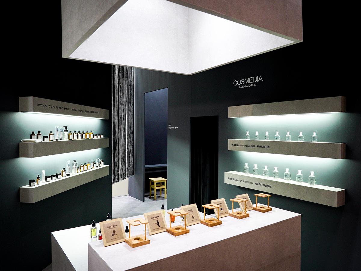 デザイン設計から施工まで担当させていただきました。ブースの明るさを求められるお客様が多い中、コスメディア様側は間接照明を駆使し展示物を魅せる、店舗のようなおしゃれな空間となりました。2社共同出展のため、異なる世界観を1つのスペースをまとめたブースとなっています。