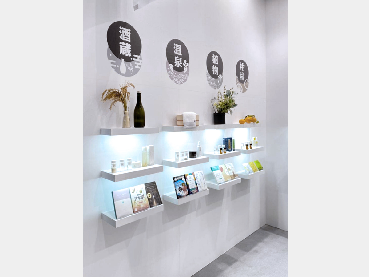 オールホワイトというご希望を元にデザインいたしました。1コマ、1面開放のスペースですが、透け感のある暖簾や棚板の陳列により狭さを感じさせず、入りやすい洗練された印象のブースとなりました。