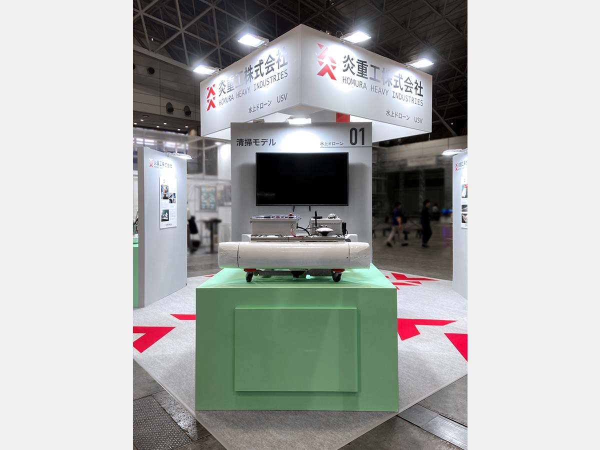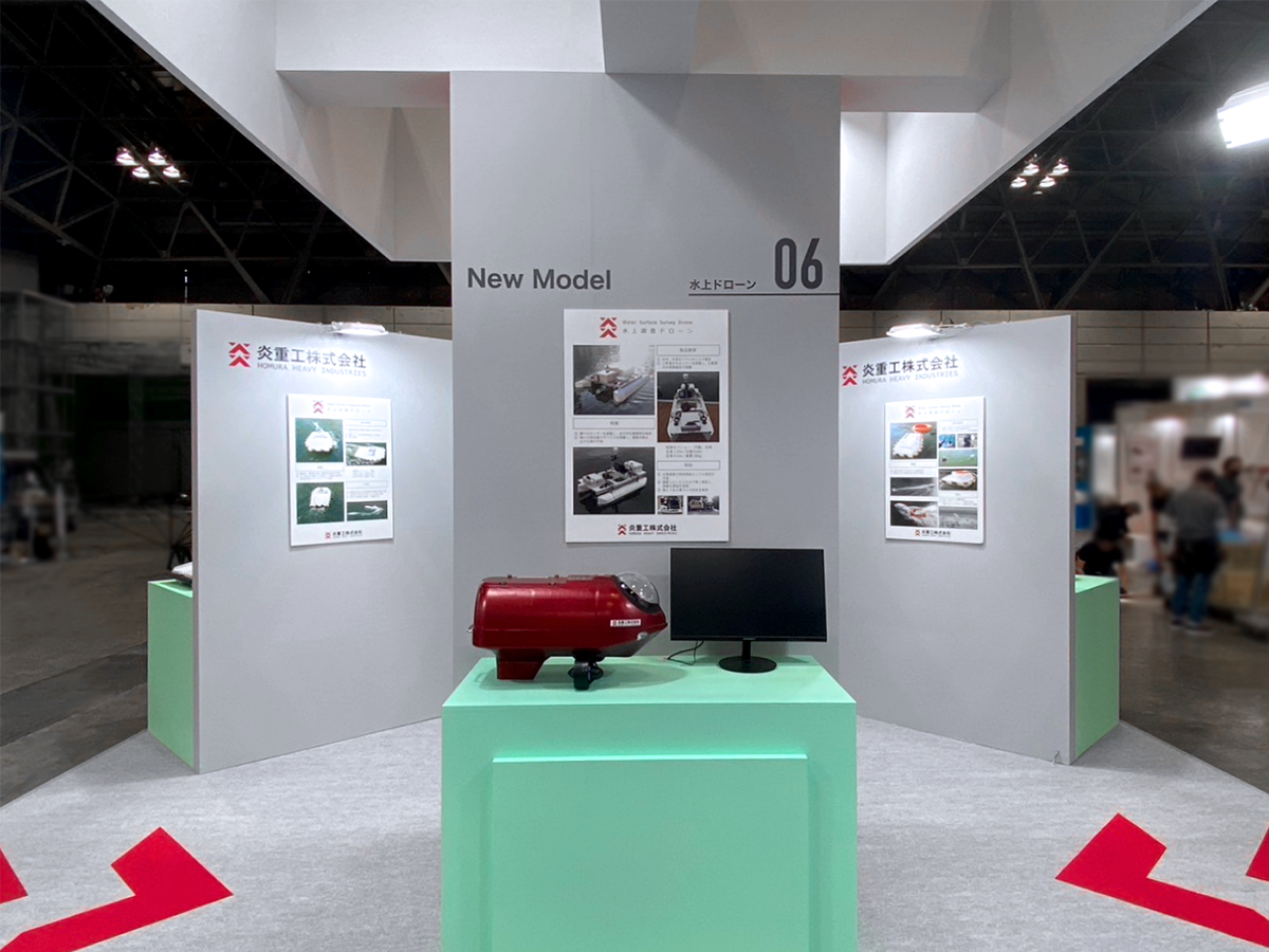 デザイン設計から施工まで担当させていただきました。4面開放のオープンスペースを生かしたレイアウトに、炎重工様のロゴである炎を矢印として床に展開。ブース内部へ誘導するサインとして機能しています。使いたいカラーとしてご指定頂いたミントグリーンが、来場者の目を引くブースデザインとなりました。炎重工株式会社様公式サイト:https://www.hmrc.co.jp