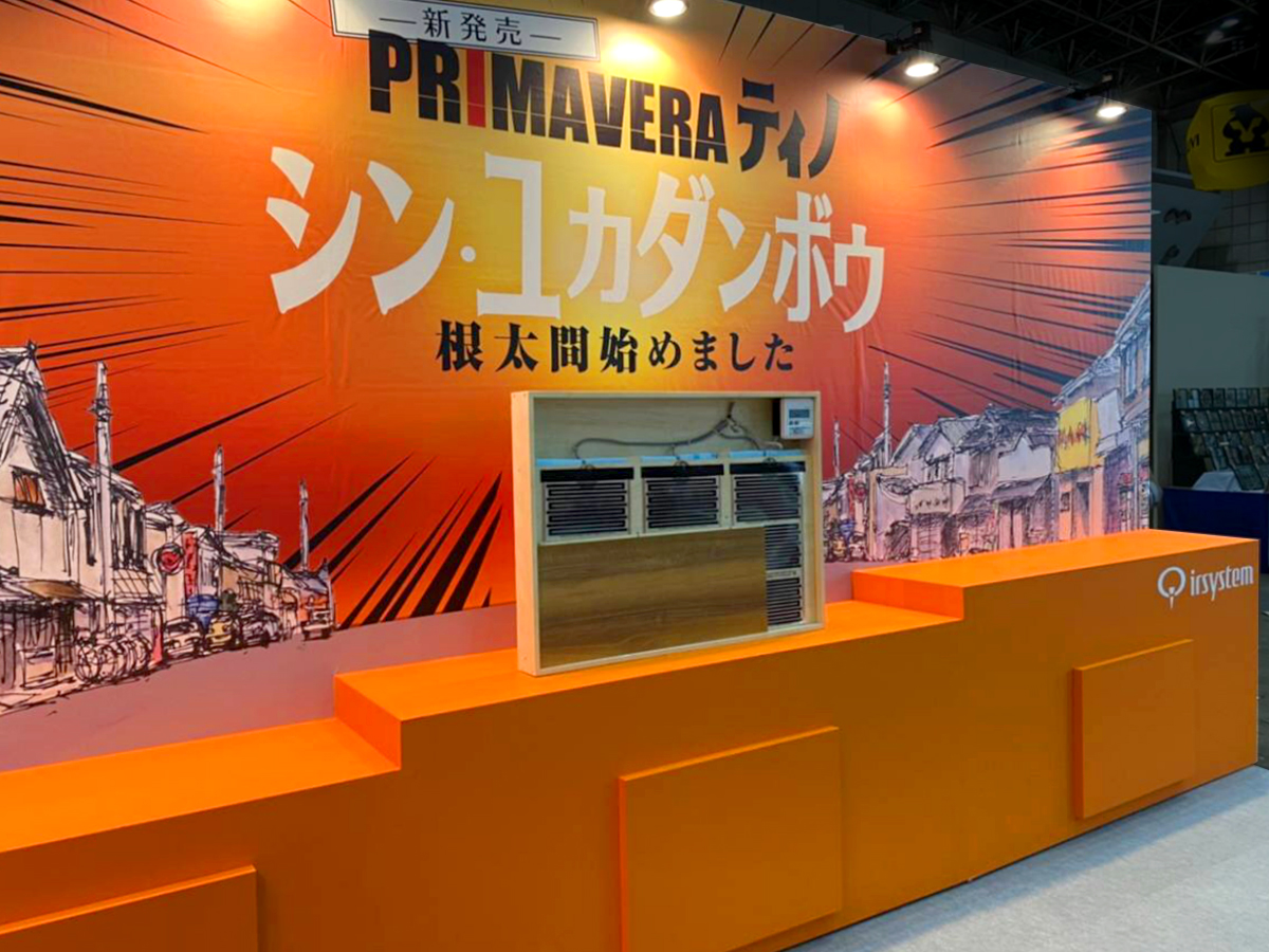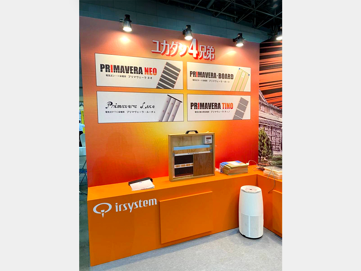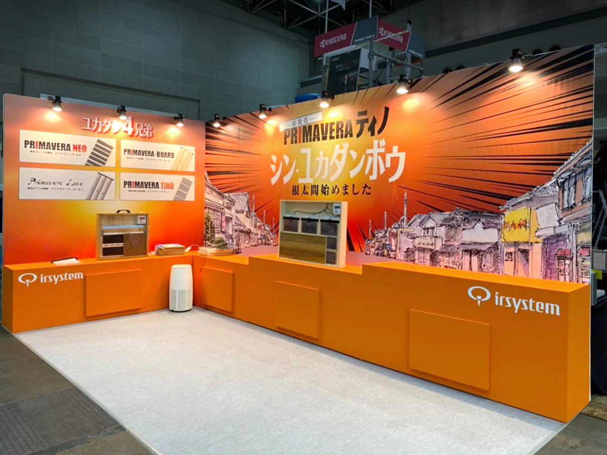 床暖房の暖かさをイメージしたオレンジブース。クライアント様のご希望で昭和レトロ風なグラフィックを制作させていただきました。(株)アルシステム様公式サイト:http://www.irsystem.jp