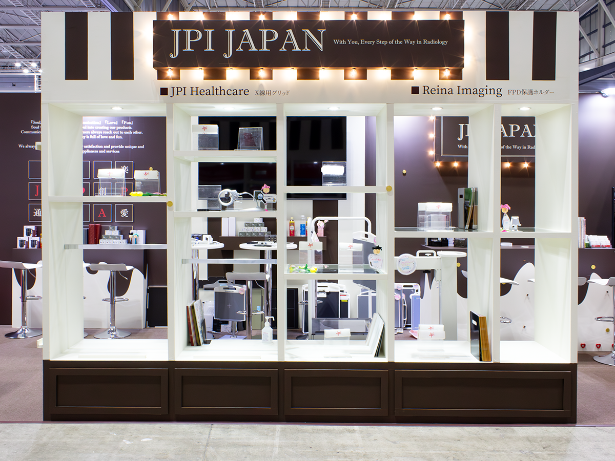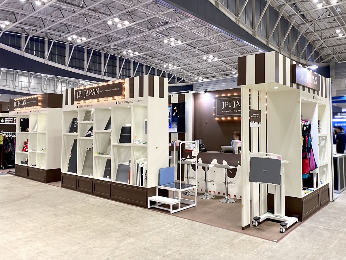 いつもテーマを設定されブース全面にその世界観を展開されるJpi様。今回のテーマは「チョコレートのイメージ」とのご要望です。板チョコのブロックやとろける表現をグラフィックや造作に盛り込み、ストライプ柄やガーランドライトを組み合わせることで、ポップな印象をプラス。全体はホワイトとチョコレートカラーであるブラウンの2色で統一し、装飾性を保ちながらも商品を際立たせるブースとなりました。