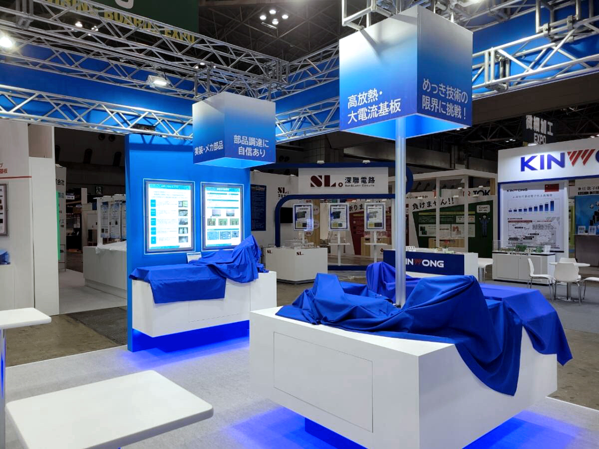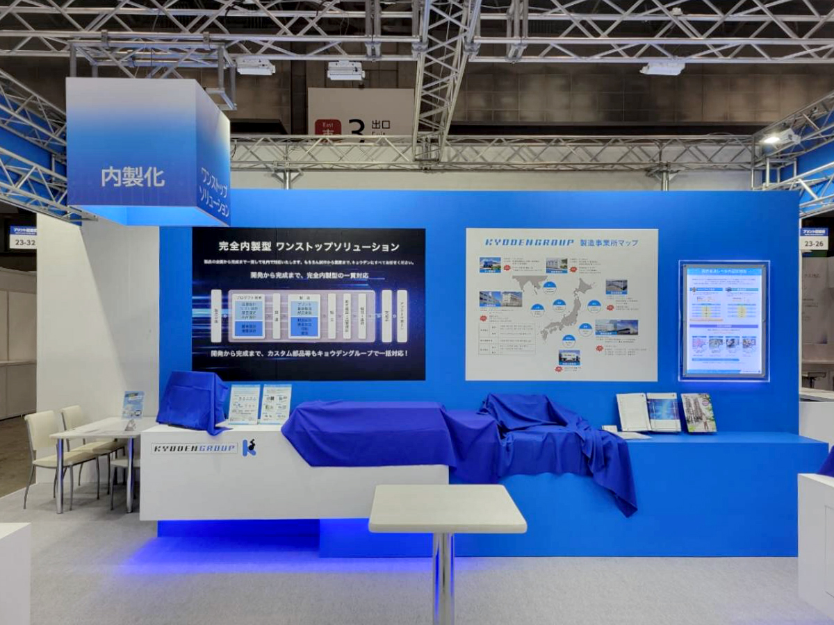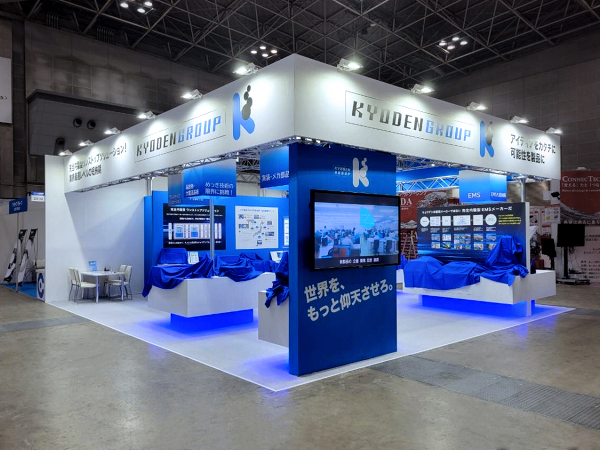 キョウデン力、キャッチコピーの訴求がテーマとなり、キョウデン様とサイン計画を詰め、ワードでしっかりとキョウデンを訴求いたしました。トラスからの照明でブース全体をより明るくし、更に浮遊感のある展示台の演出やカテゴリーサインがアクセントとなり、シンプルな形状ながら目を引くブースに。LEDパネルや卓上パネルも弊社が担当し、トータルで世界観を創り込んだブースとなりました。