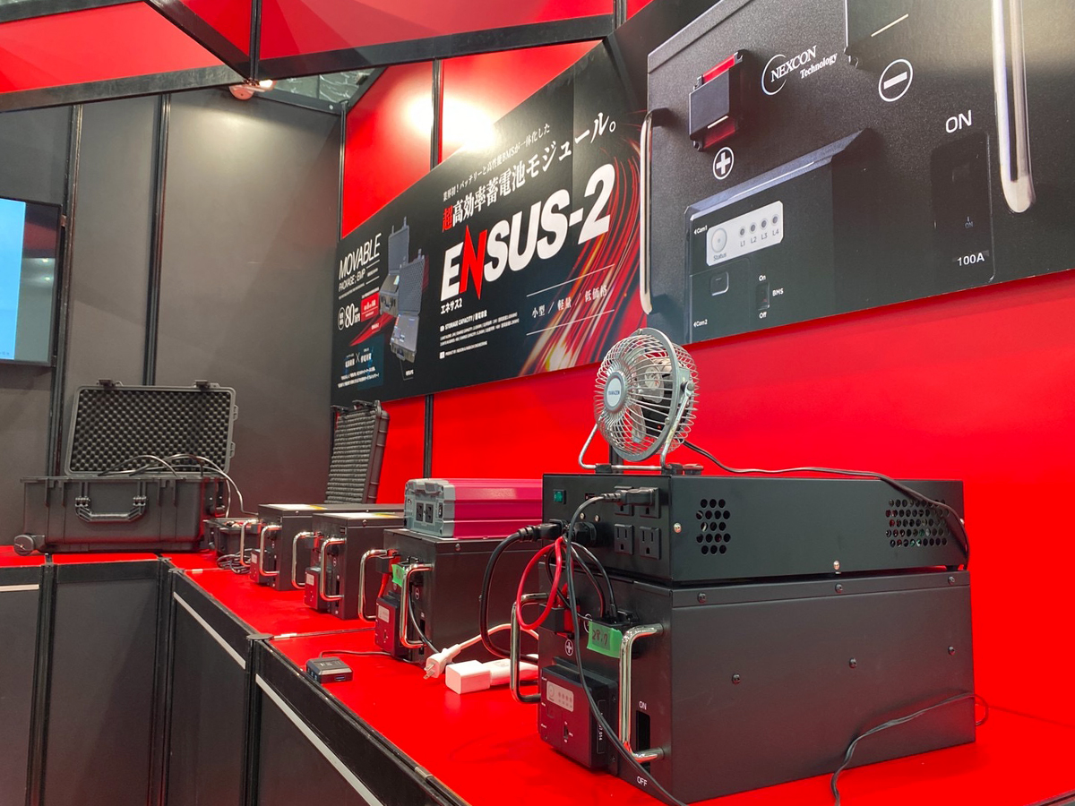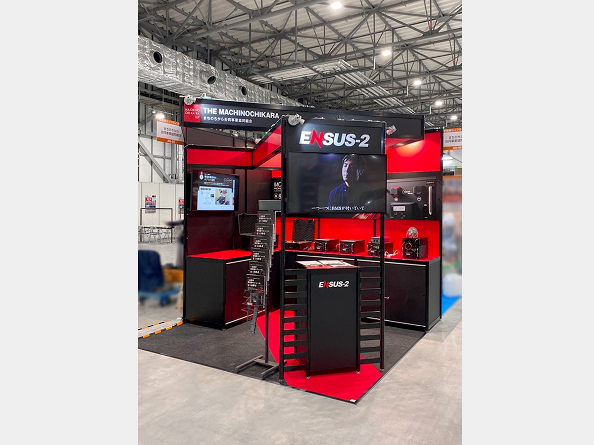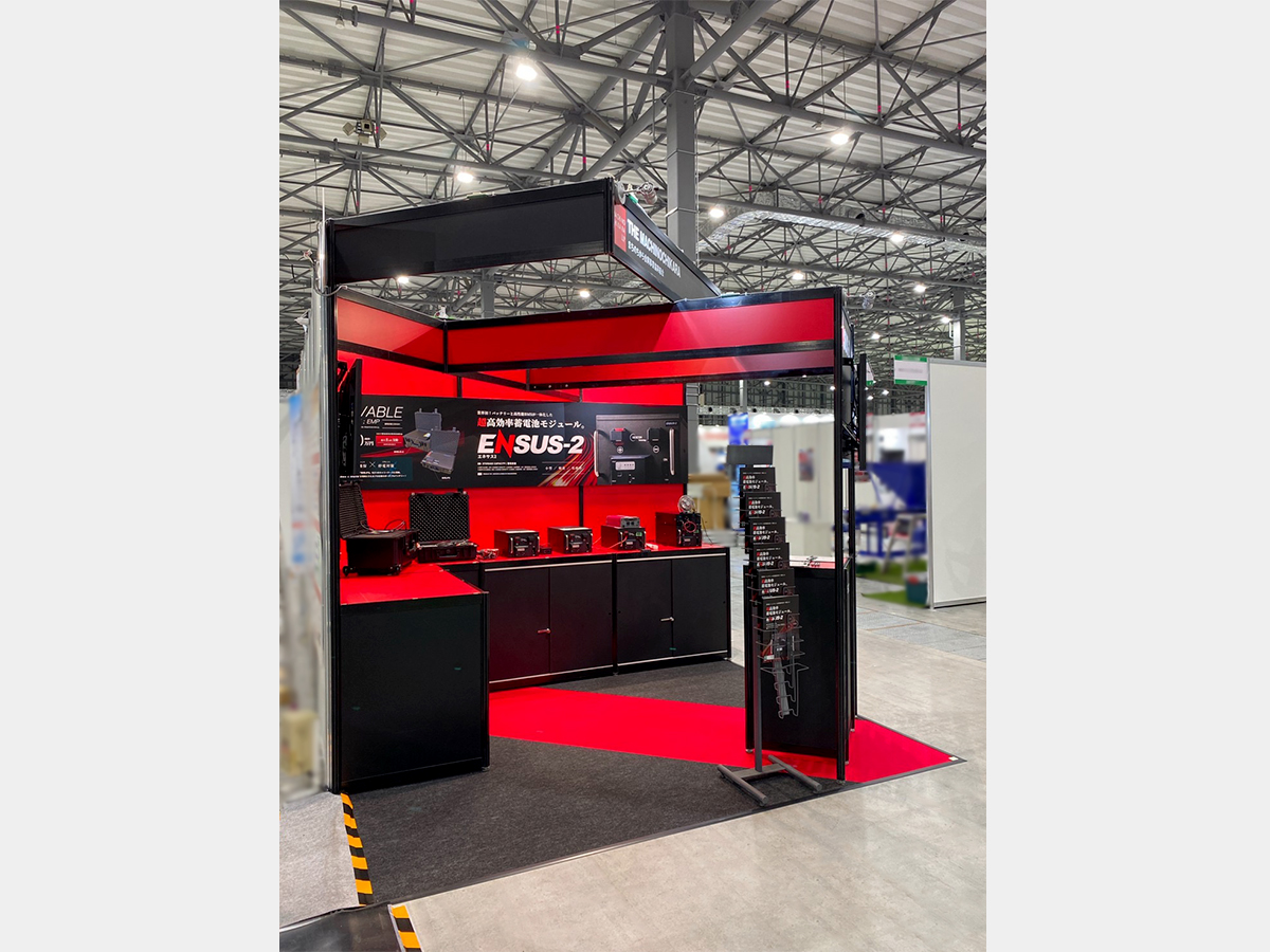 システム部材でもここまで面白い空間ができると証明したブース。黒ベースにアクセントカラーの赤が映える力強い仕上がりとなりました。