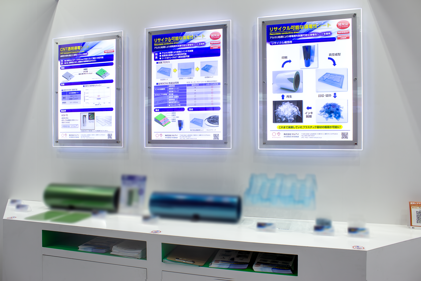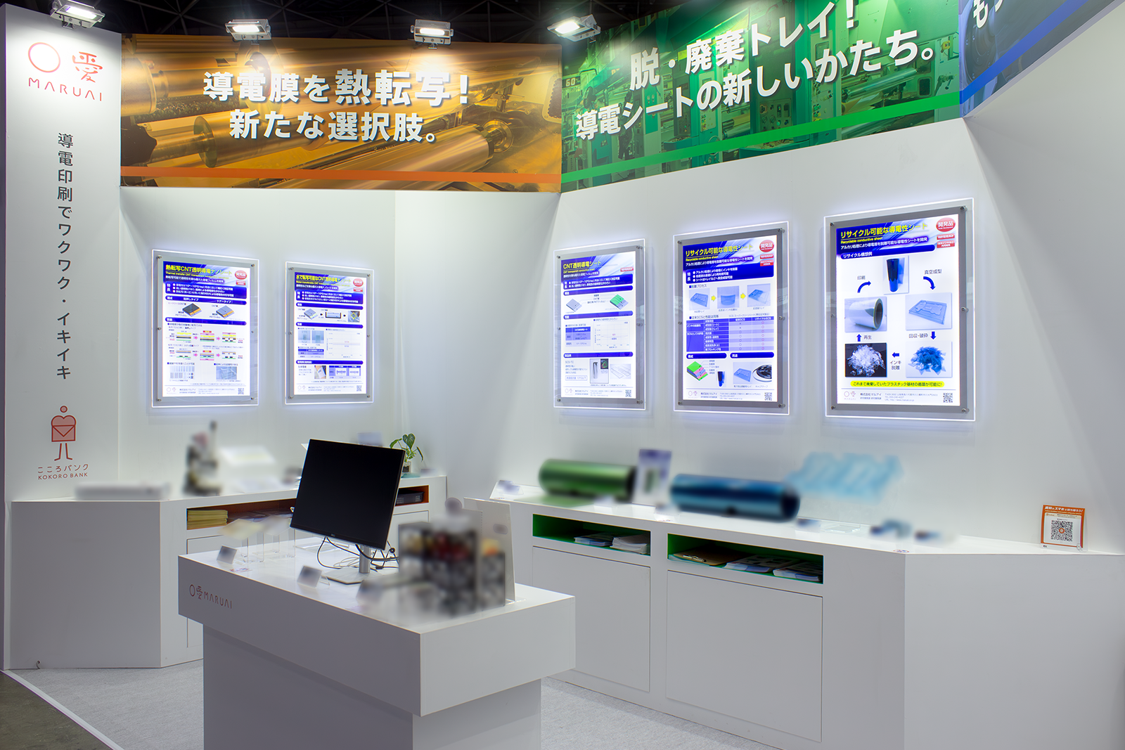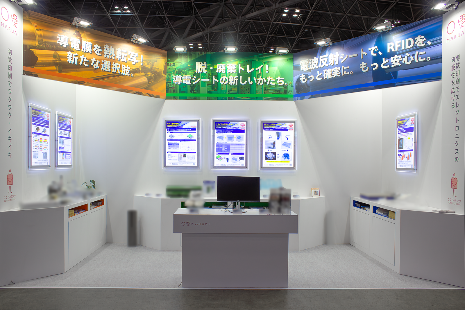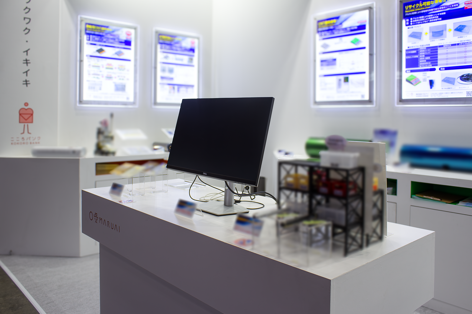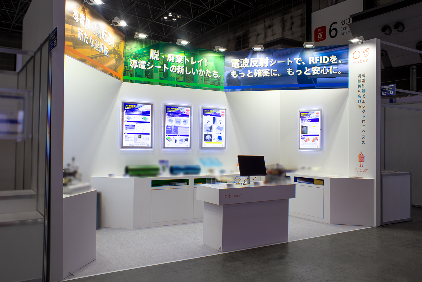 色分けした分かりやすい展示をとのご要望でした。2コマですが狭さを感じさせないすっきりと分かりやすいブース展開となりました。㈱マルアイ様公式サイト:https://maruai.co.jp