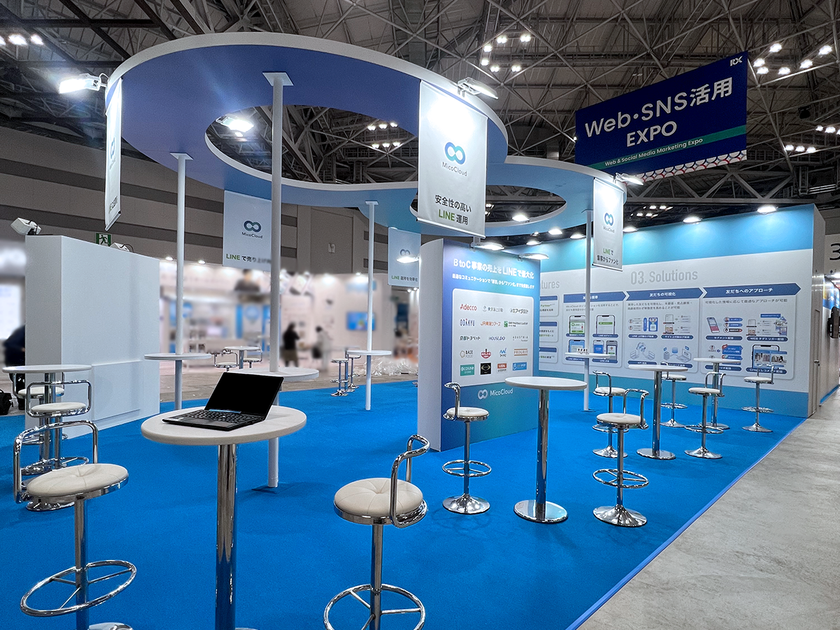 コンペにて受注、デザイン設計から施工まで担当いたしました。ロゴマークのフォルムをダイナミックに打ち出し、商談メインの活気あるオープンなブースです。スタイリッシュに仕上がりました。