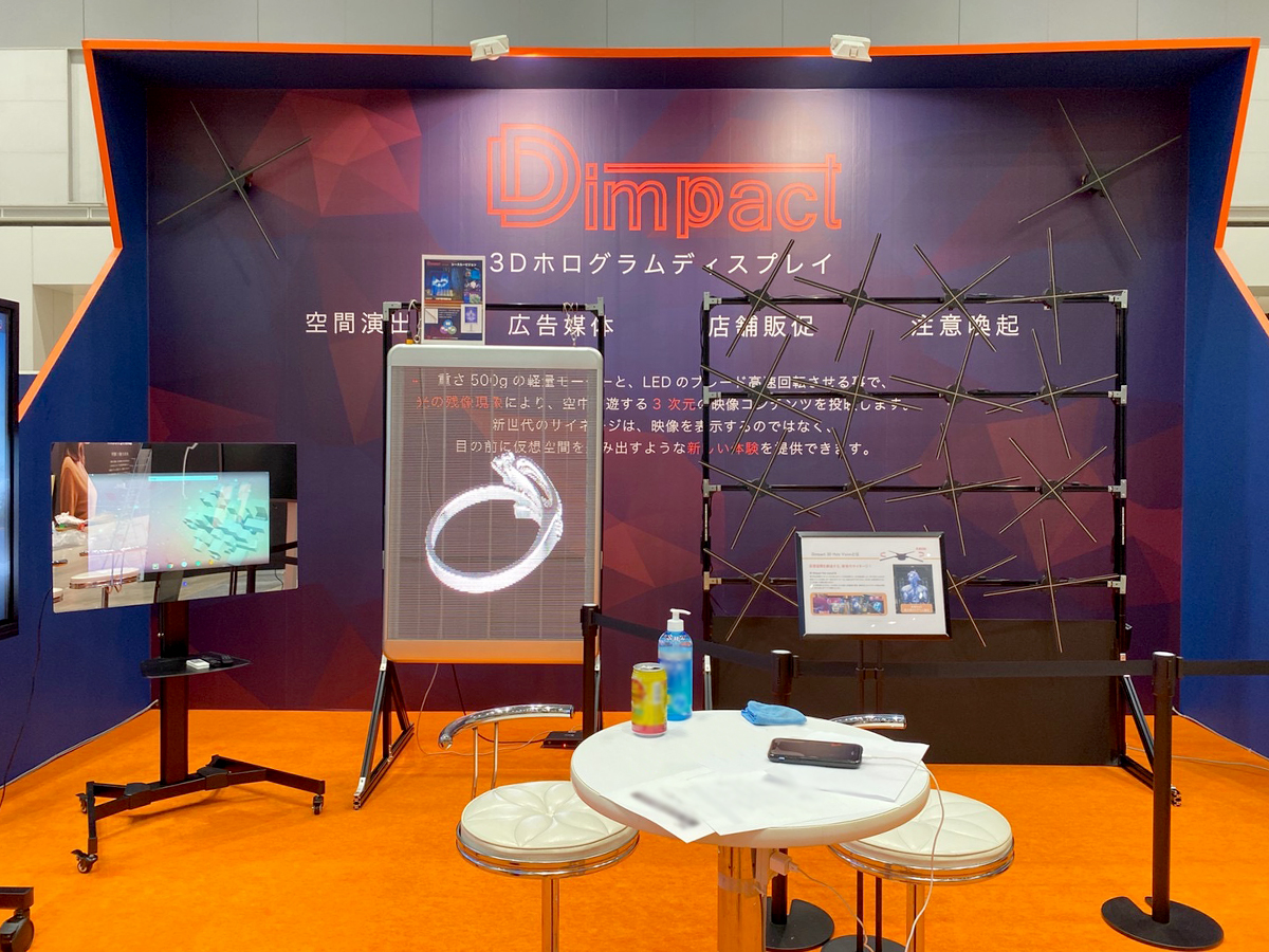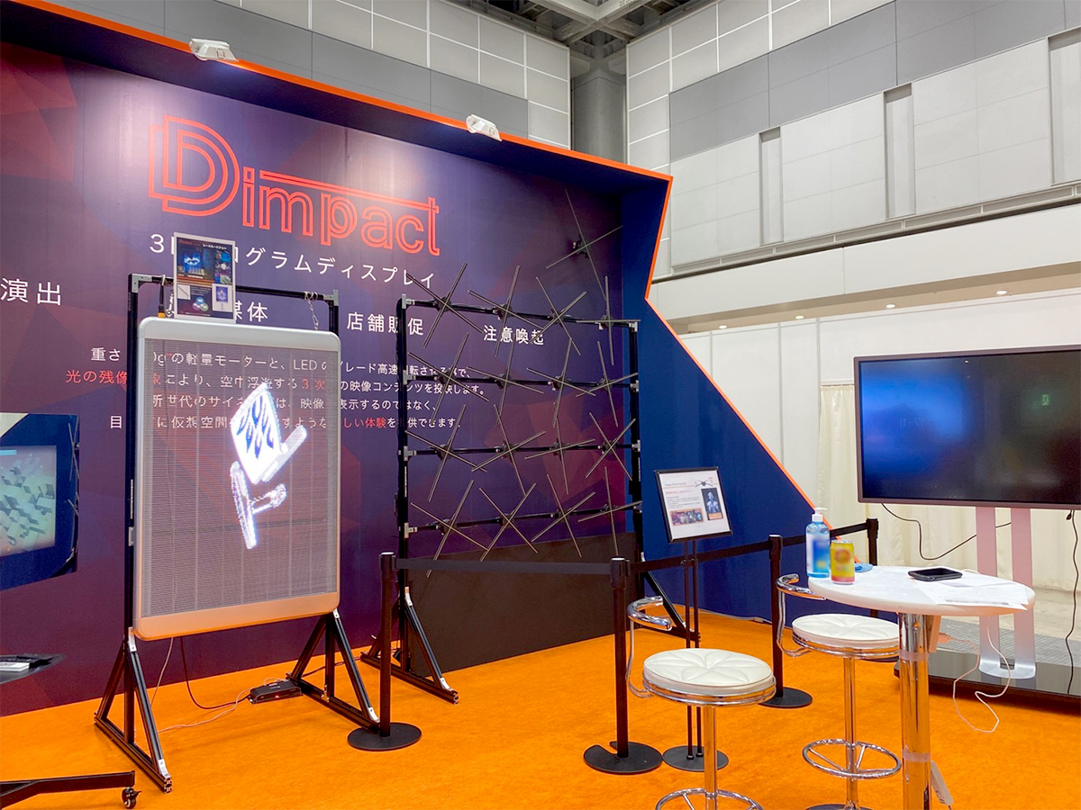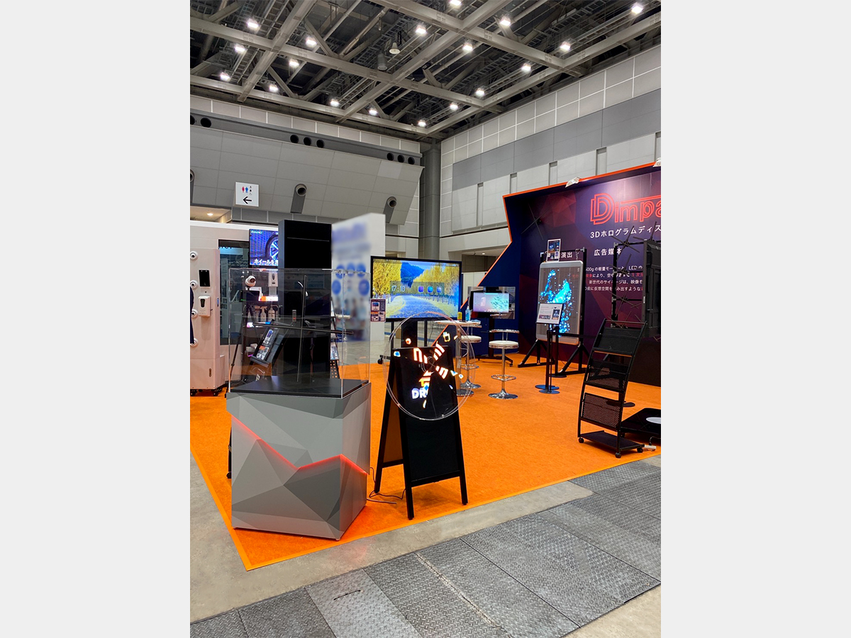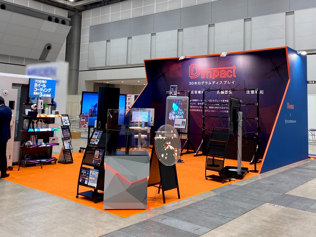 高さ3600mの大迫力な壁面をアイキャッチに、実際の商品を展示。ロゴとグラフィックでクールさを演出したブースです。商材自体もインパクトのある商品で、来場者の反応は上々でした。