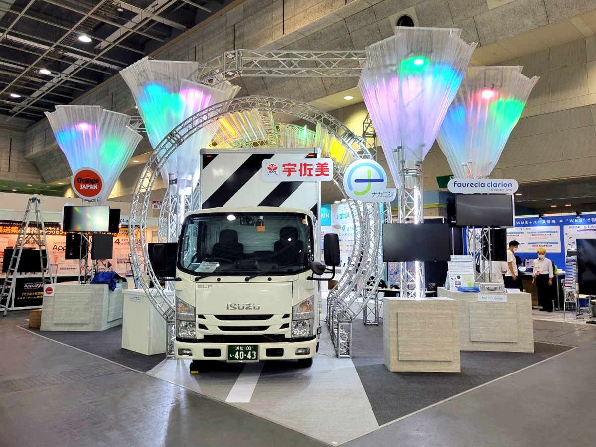 3Dカメラ荷室掲載率計測システム、ロボット点呼、運送業務管理クラウドサービス、タイヤ空気圧センサー、デジタコ・ドラレコ電装品、その他様々な展示をしたブース。5m越えのトラス組みでこだわりの照明が目印のブースとなりました。中西商会株式会社様公式サイト:https://nakanishi-shokai.com