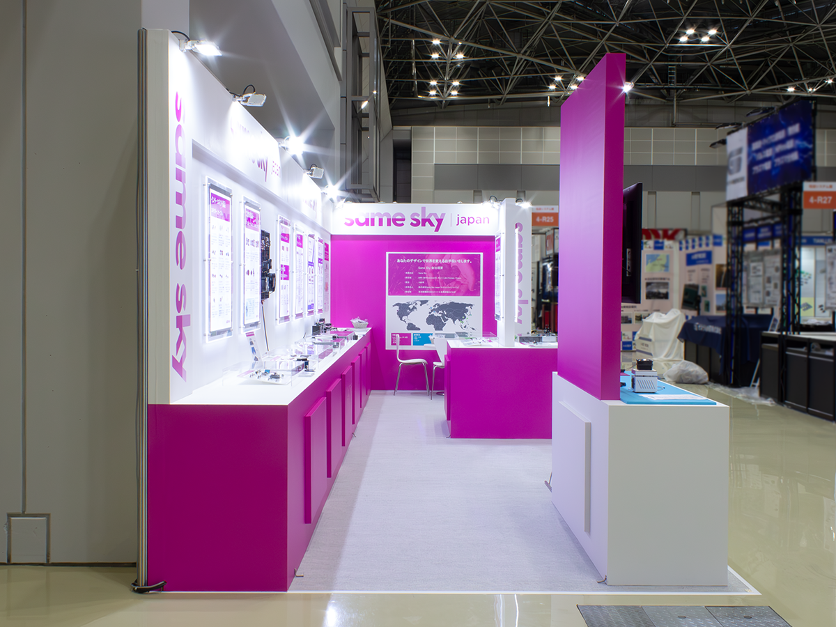 デザイン設計から施工まで担当させていただきました。企業ロゴのマゼンダカラーを基調に、ホワイトとのコントラストで視認性を意識しました。無駄を省いたシンプルな構成ながらも鮮やかな色彩が際立ち、会場内で存在感を放つブースデザインとなりました。