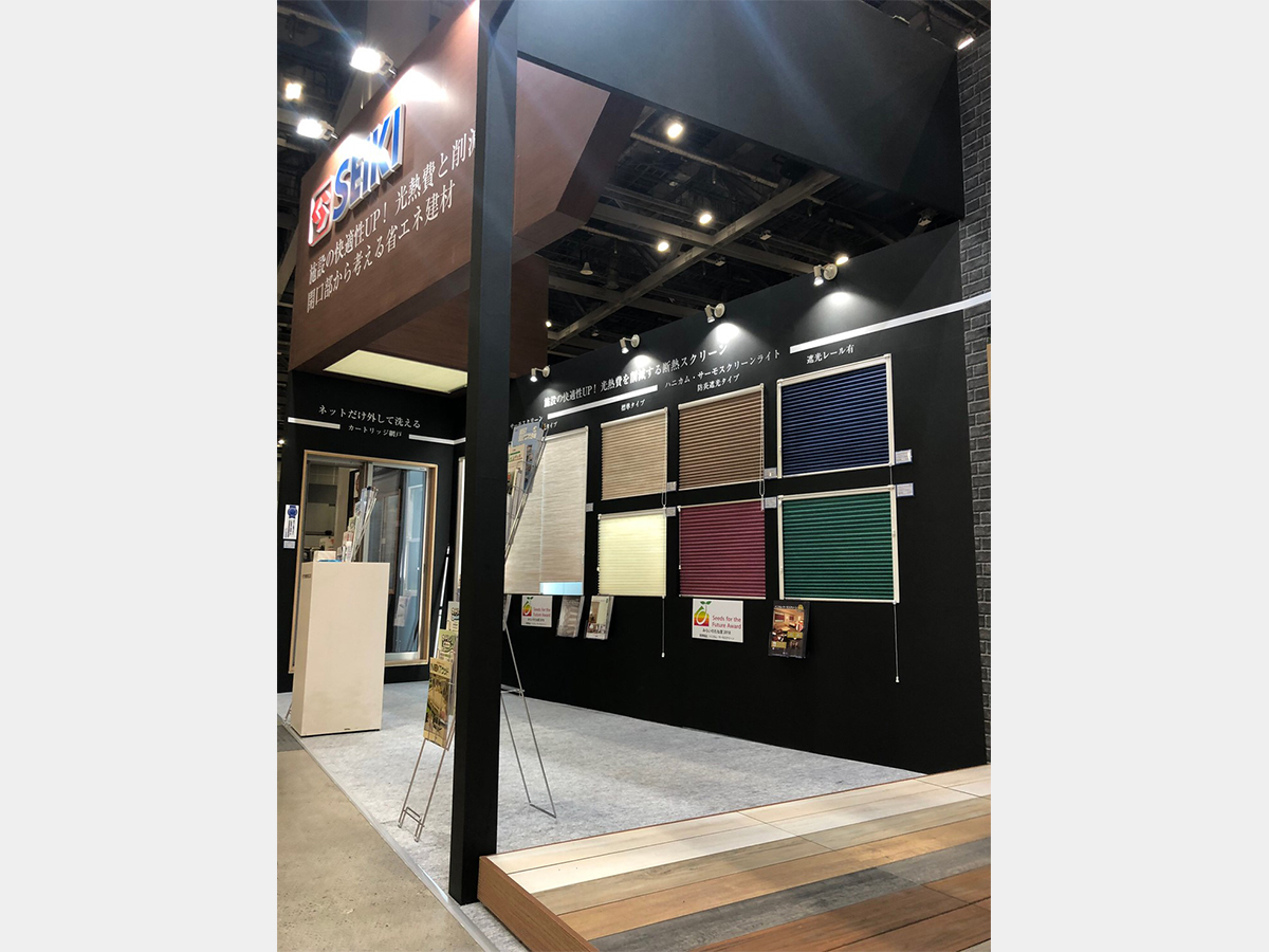 ブース構造と建材展示を兼ねたデザイン。建材を一つ一つ理解しながらブースに組み込んでいくことでレイアウトも必然と決まりました。高さを最大限に生かし迫力を出し、スタイロ文字で社名を訴求しています。