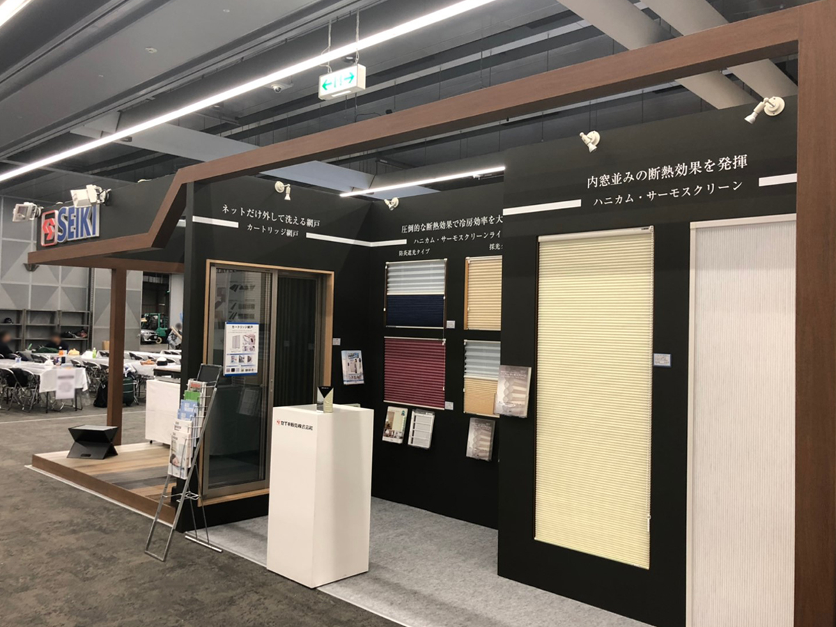 継続してご依頼頂いておりますセイキ販売株式会社様。前回同様、建材の展示も兼ねた構造体を生かしたブースデザイン。建材の特徴やデザインを一つ一つ理解しながらブースに組み込んでいき、訴求したい内容を明確にしたブースとなりました。