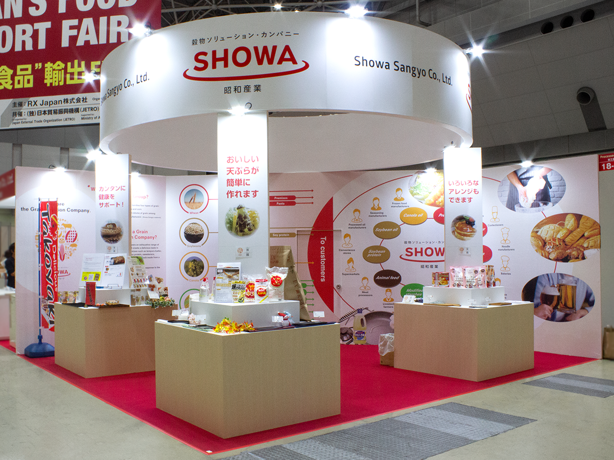 HPをご覧になってお問い合わせくださり、コンペにて受注させていただきました。”日本の食品”輸出EXPOの特徴として海外の来場者様も多いということで、コーポレートカラーの赤と白をはじめ、木目を利用して和を感じられるテイストにしています。展示台上のディスプレイは昭和産業様がご自身で手掛けられ、壁面グラフィック含め食品展らしいブースとなりました。