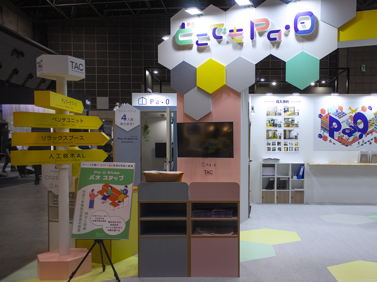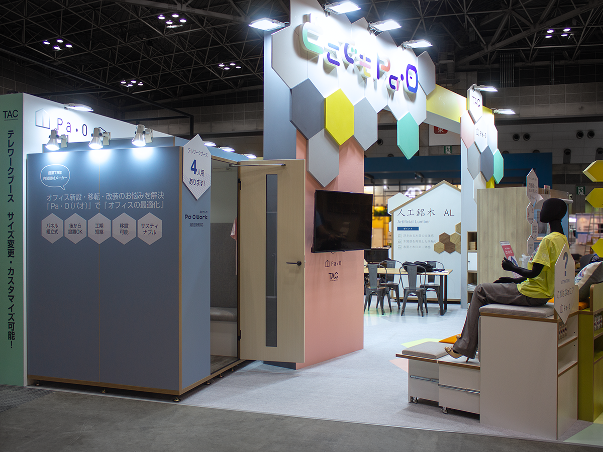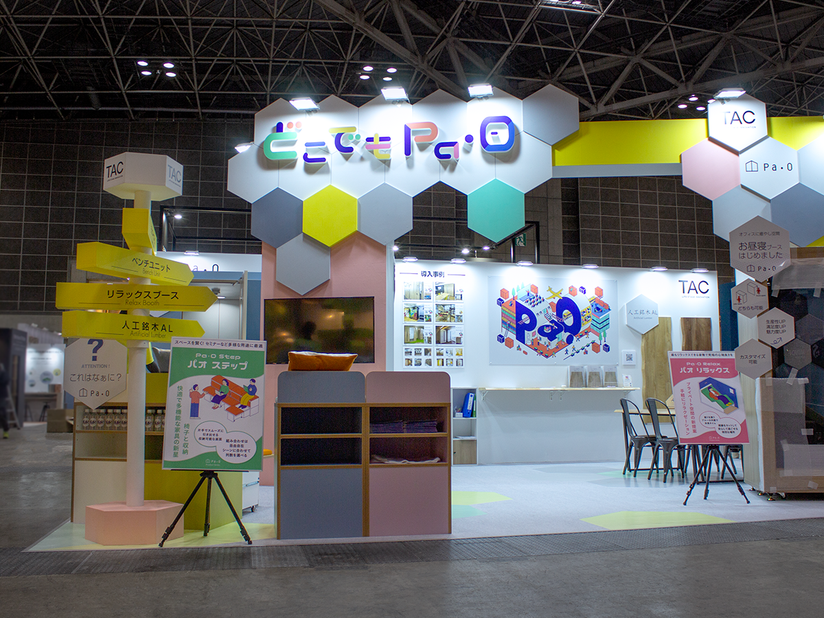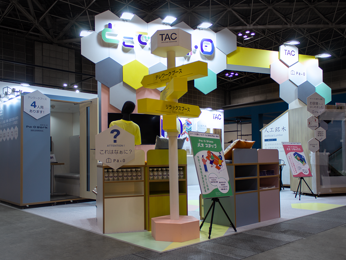 デザイン設計から施工まで担当させていただきました。昨年のオルガテック東京2023のブースカラーを継承し、ペールカラーやハニカムフォルムを取り入れ、展示商品「Paoシリーズ」の素敵な世界感を生かせるようなブースデザインに。TAC株式会社ご担当者様には大変お気遣いいただき、終始スムーズな進行と密なお打ち合わせにより細部まで調整することできました。シックなブースが多い中で、目を引く空間ができ満足度の高いブースとなりました。