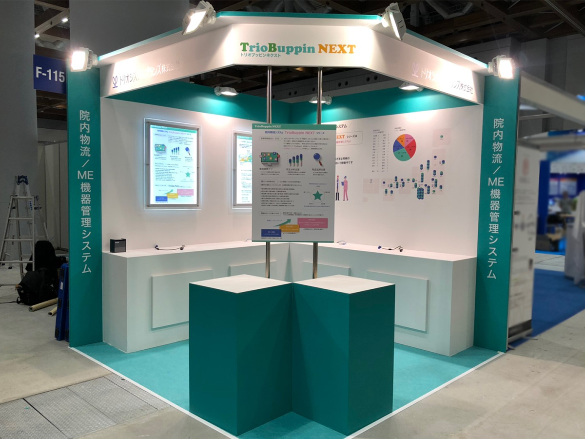 トレンドのカラーをメインカラーとし、グラフィックもトーンを合わせて一体感を出し清潔感のある綺麗なブースになりました。角地を上手く活用したパラペットと、動線の効果で来場者への対応も効果的なデザインです。