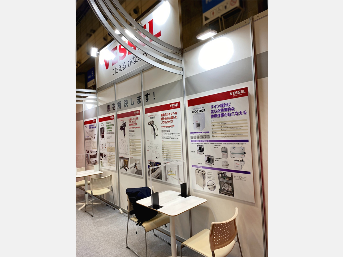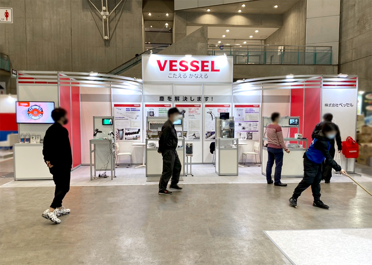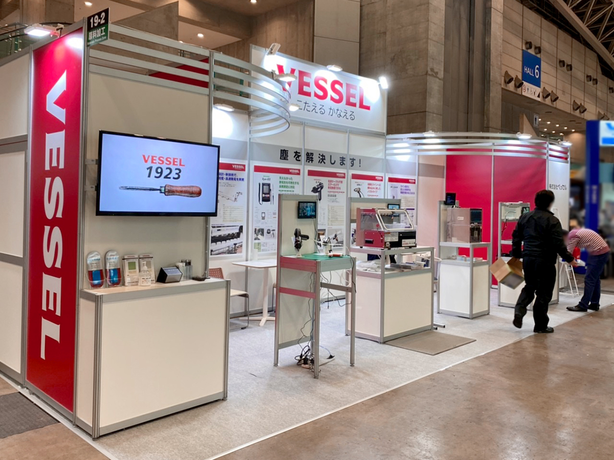 いつもご依頼いただいておりますVESSEL様。今回はシステム部材を使用し、VESSEL様らしいクールで力強いブースとなりました。
